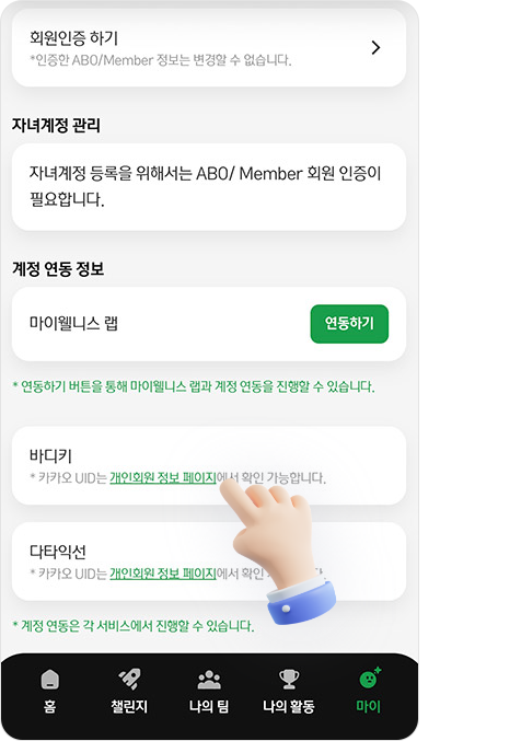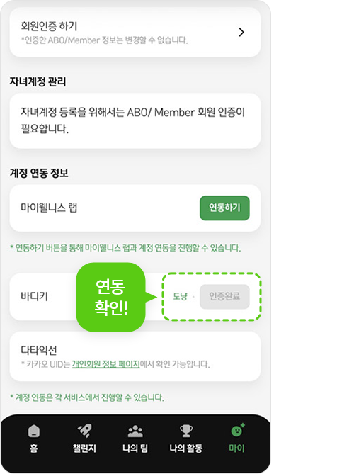 - 바디키 앱에 한번 연동한 계정은 변경 불가