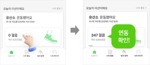 - 바디키 앱 > 오늘의 나 > 걸음 배너 터치 > 걸음수 연동 확인