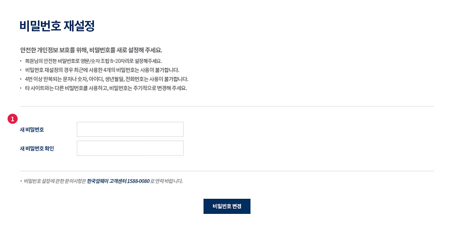 - ① 아이디 찾기와 동일하게 본인확인 후 비밀번호 찾기를 진행할 수 있으며 본인확인이 완료되면 새로운 비밀번호로 변경할 수 있습니다.