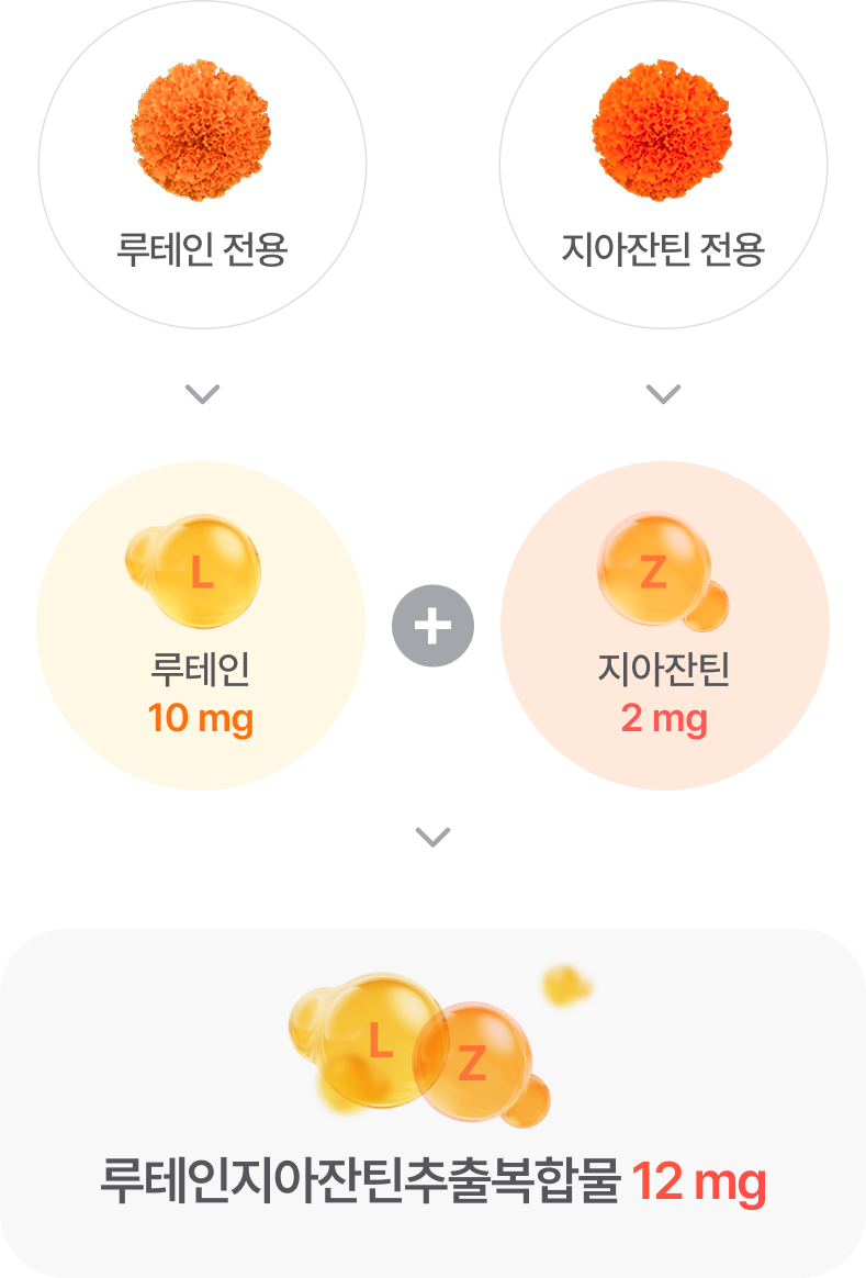 전용 품종으로 재배된 마리골드 꽃에서 루테인과 지아잔틴을 각각 추출 배합하여 불순물을 줄인 순도 높은 원료를 완성했습니다.