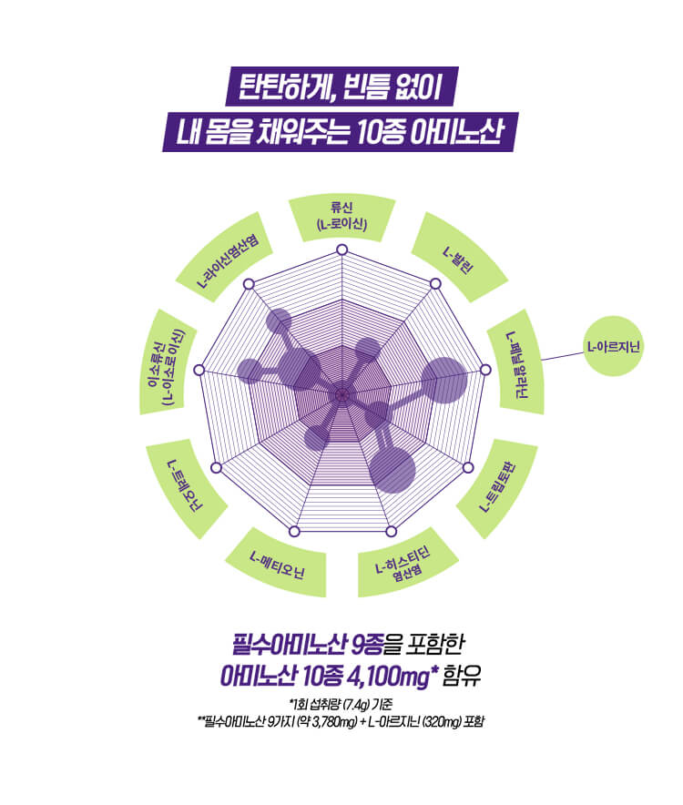 영양성분1포(7.4 g)당 열량 25 kcal, 나트륨 35 mg(2 %), 탄수화물 4 g(1 %), 식이섬유 0.3 g(1 %), 당류 0 g(0 %), 지방 0 g(0 %), 트랜스지방 0 g, 포화지방 0 g (0 %), 콜레스테롤 0 mg(0 %), 단백질 3 g(5 %) L-로이신 1967 mg, L-발린 394 mg, L-이소로이신 394 mg, L-라이신염산염 355 mg, L-아르지닌 320 mg, L-트레오닌 297 mg, L-페닐알라닌 213 mg, L-메티오닌 108 mg, L-히스티딘 53 mg, L-트립토판 1.9 mg